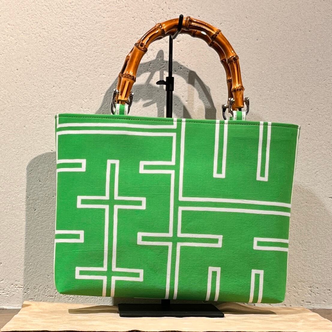 竹持手バッグ横型 #端(緑色地に白色柄)