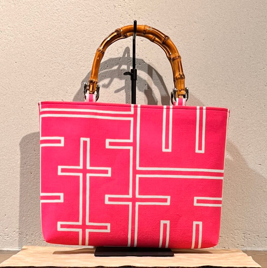 竹持手バッグ横型 #端(ピンク色地に白色柄)