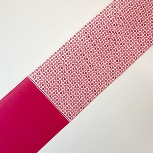 綿引き染めの三尺帯、昔ながらの技法にこだわって製作致しました。両端に無地場が約45㎝づつあります、小粋に結んで下さい。 素 材/綿 サイズ/総長約3m・幅約34cm カラー/白地に秋桜色柄