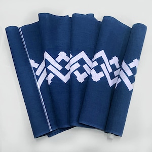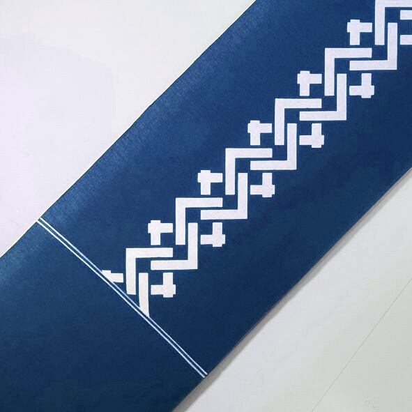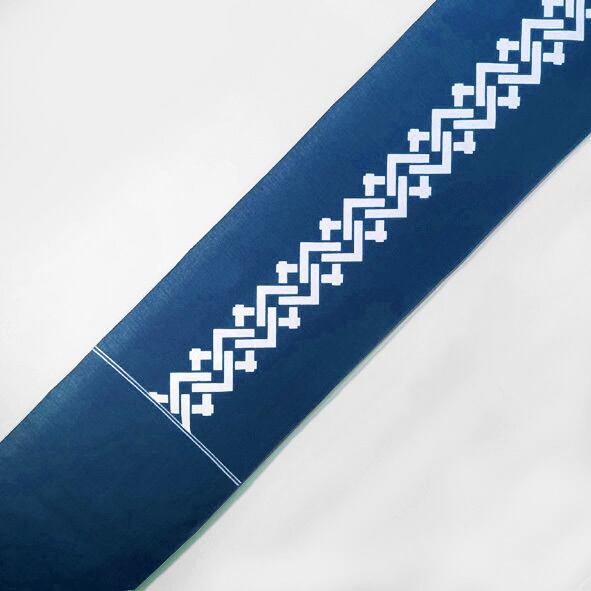 綿引き染めの三尺帯、昔ながらの技法にこだわって製作致しました。両端に無地場が約45㎝づつあります、小粋に結んで下さい。 素 材/綿 サイズ/総長約3m・幅約34cm カラー/紺地に白色柄
