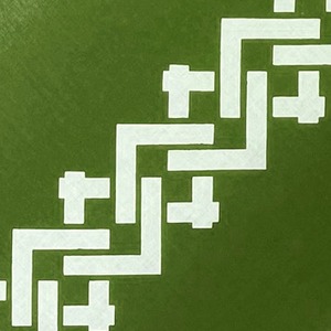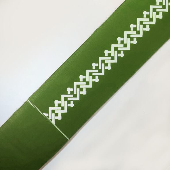 綿引き染めの三尺帯、昔ながらの技法にこだわって製作致しました。両端に無地場が約45㎝づつあります、小粋に結んで下さい。 素 材/綿 サイズ/総長約3m・幅約34cm カラー/緑地に白色柄